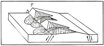 ![]() 第13図 断層山地の模式図。 矢印は運動の方向を示してある。 断層崖F-Sの麓に扇状地が発達している。 |
