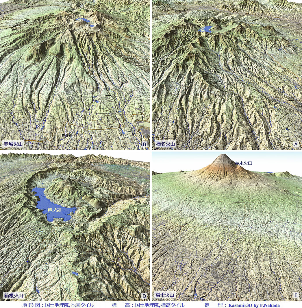 | Kashmir 3Dによる「風景あるくの記」の再現 : 主な第四紀火山と現在の山容 |
