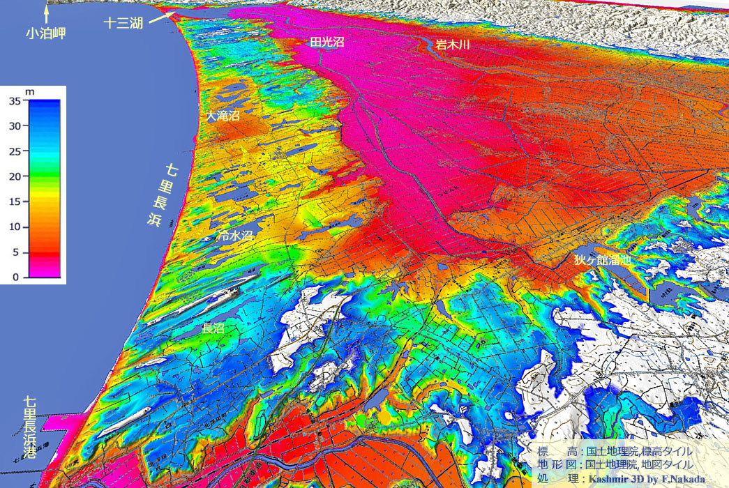 | 標高段彩図と地質の三次元イメージ : 屏風山砂丘・屏風山湿原池沼群 |