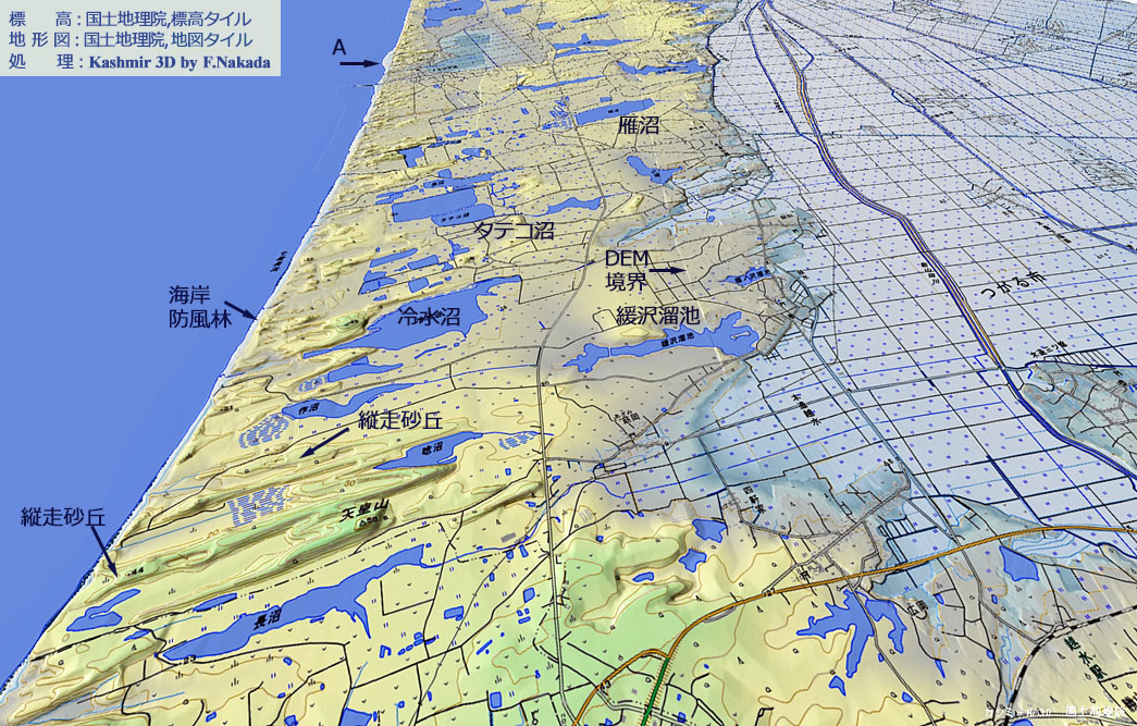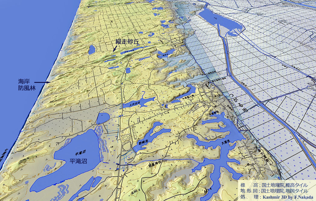 | 地形の三次元イメージ : 屏風山砂丘・屏風山湿原池沼群 |