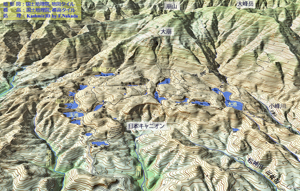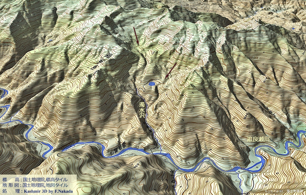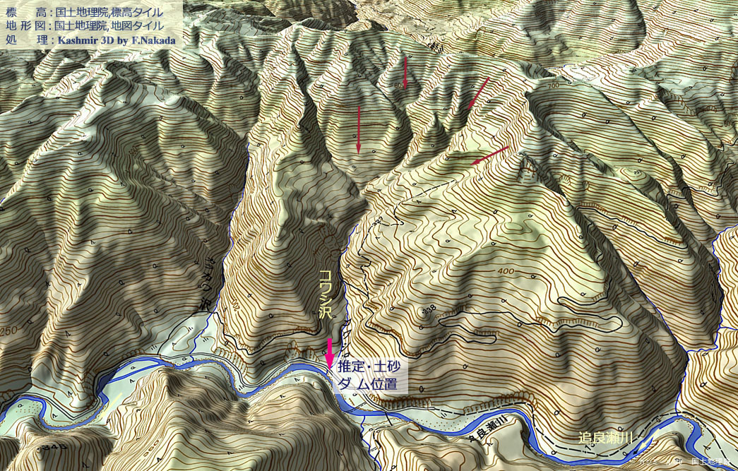 | 地形の三次元イメージ : 追良瀬川中流・濁水沢・コワシ沢(深層崩壊,地すべり) |