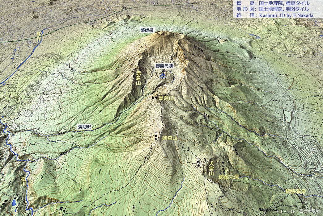 ![]() 手前の「東岩手火山(薬師岳)」は,山頂の火口が2重になっており,何回も噴火が続いたことがわかります。 奥の大きな楕円形のカルデラは「西岩手火山」によるものです。 カルデラのほぼ中央に「御苗代湖」などの火口湖が存在しています。 |