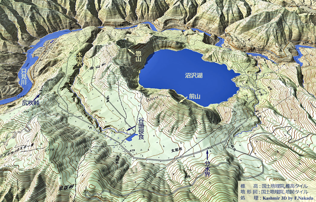 ![]() 「惣山」と「前山」は独立した溶岩円頂丘です。 また,「谷頭侵食」と記載した凹地は,約5400年前の「沼沢湖火砕流」が堆積している場所です。 未固結であるため,雨水の侵食力が強く,極めて明瞭な「谷頭侵食露頭」が存在するようです(現地調査未実施)。 |