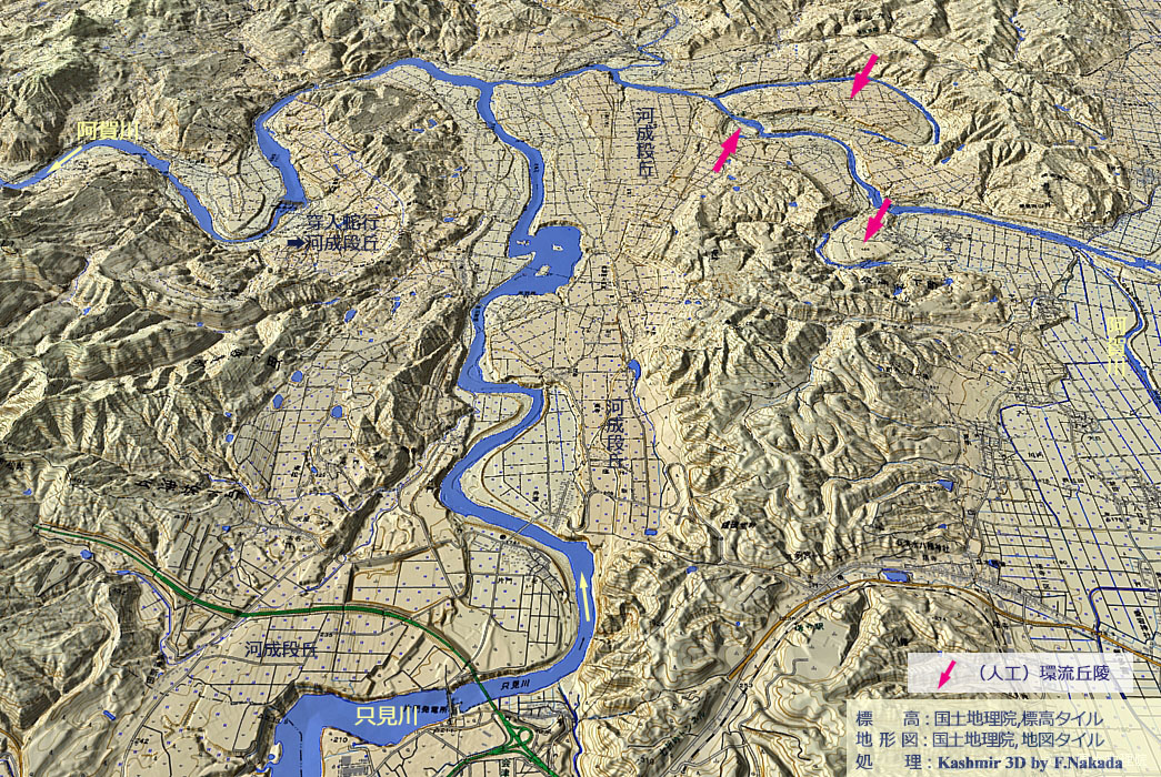| 地形の三次元イメージ : 阿賀川の(人工)環流丘陵群 |