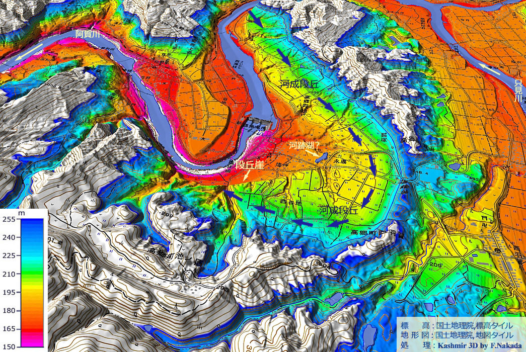 環流丘陵,蛇行切断,捷水路,河岸段丘(河成段丘),新期断層変位地形,活断層 |