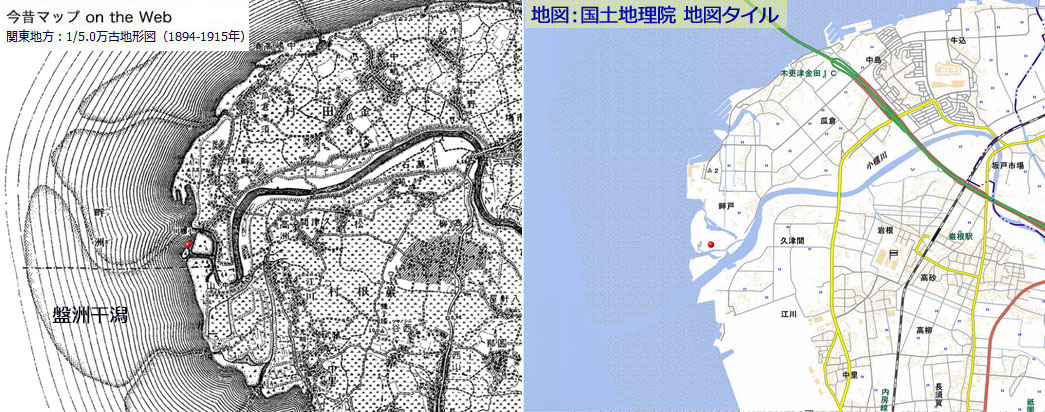![]() 木更津市郊外の小櫃川河口は,大局的にみる場合,明治期とそれほど変わっていないようです。 近代化されたのは「東京湾アクアライン」と「鉄道」くらいでしょうか。 この地図だけではわかりませんが,左右の枠外はいずれも海岸線が埋められて,大きな工場地帯に変わってしまいました。 |