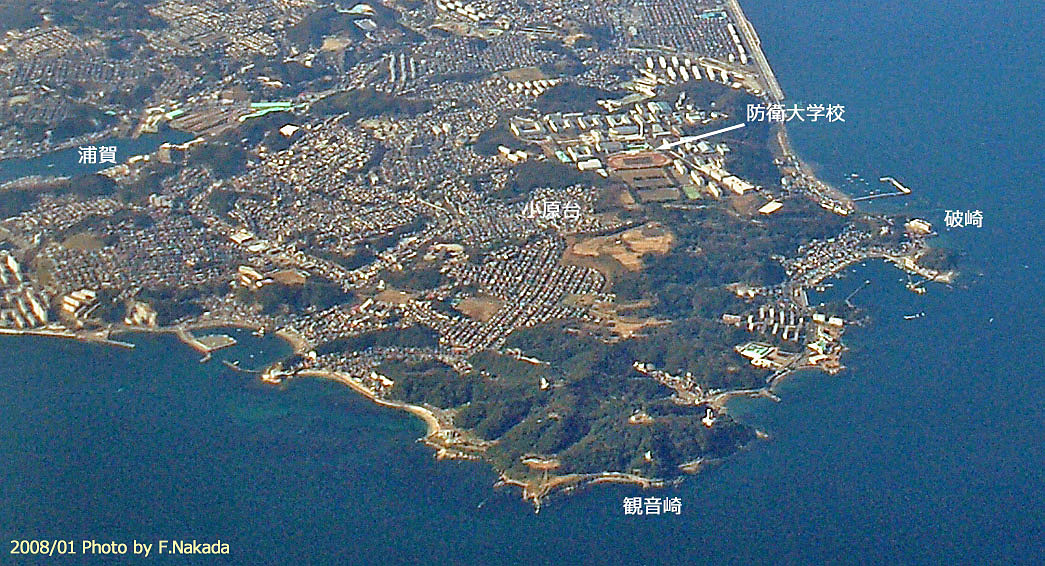 ![]() 東京湾上空から。 この写真には影が無いので,防衛大学校が存在する「小原段丘面」と,その周囲の土地[例,小原台(町名)]との区別がつきません。 |