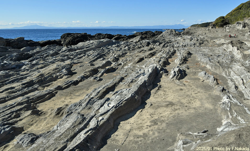 ![]() 遠くからですと,この「隆起波食棚」はほぼ平坦地のように見えますが,実際には1m~数mの凹凸があり, 海水が入り込んでいる亀裂も随所に存在しています。 ただ,砂地の所はあまりありません。 5万分の1地質図幅『三崎』によると,この隆起波食棚の地質は,新第三紀の「三浦層群,三崎層・Ms4(付加体)」と判定されています。 |