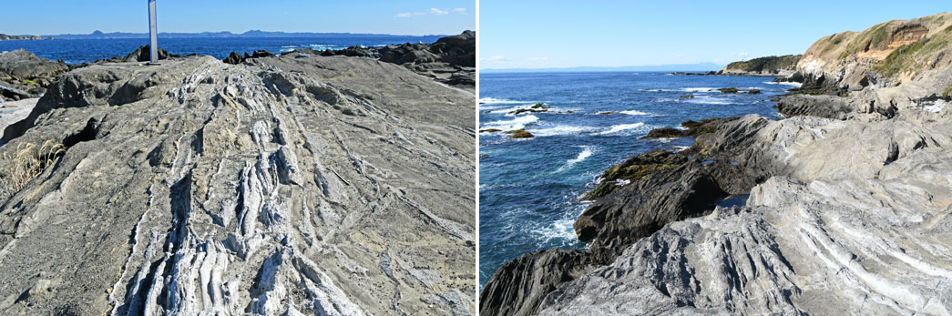 ![]() (左)安房崎の先端方向です。 海の向こうは安房の国,今の房総半島南端部です。 (右)安房崎近くからの城ヶ島南東海岸です。 島で唯一の「海食崖」が続いており,隆起波食棚は存在しません。 初音層は急傾斜なのですが,途中に入る亀裂によって切断されたり,地層自体がぐにゃりと折れ曲がったりと, 連続性を追うのも難しいのですが,中にはある程度追跡できるのもあるようです。 |