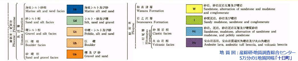 ![]() 西側斜面の「四十日峠」~「枯木又川」間の地質は「魚沼層・礫シルト相」と同一であるのに対し, 東側斜面では「魚沼層・礫シルト相」,「魚沼層・砂礫相」,「和南層」及び「岩之沢層」の4つの地層が出現します。 |
