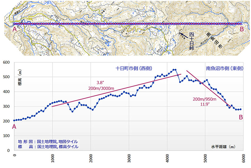 ![]() この地形断面に限定すると「分水界」より西側の傾斜は平均約3.8゜となり,東側はその3倍の平均11.9゜となります。 |