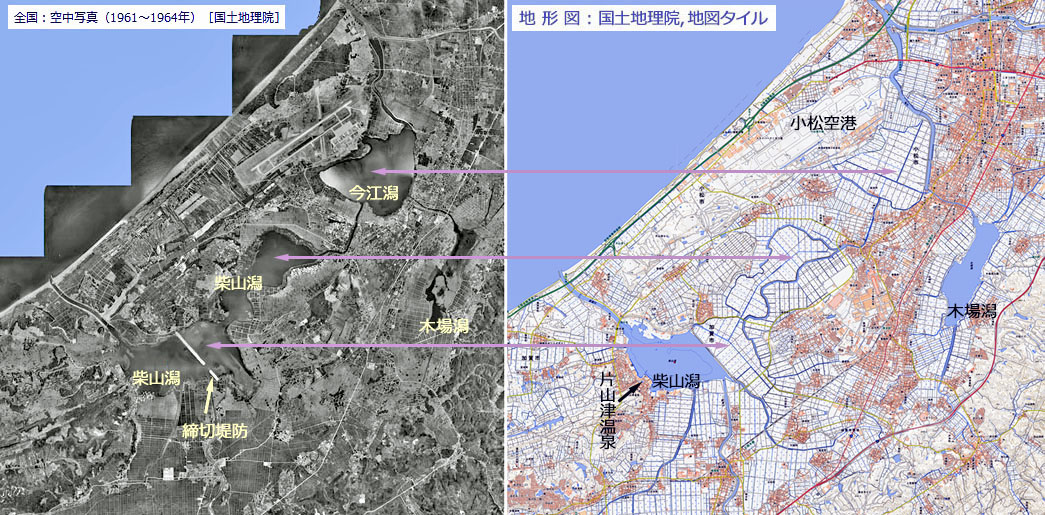 ![]() 江戸時代から,食糧増産を目指した「干拓の話が出ては消え」が,繰り返したようですが,戦後になって本格的に干拓が始まりました。 その結果,「今江潟」は完全に陸地化され,「柴山潟」は「片山津温泉」の前面を除いた範囲が陸地化されました。 「木場潟」については,洪水に備えた調整池としての機能のために,そのままに残されています。 注 右の地理院タイルについては,12枚のスクリーンショットを合成したので,多少のひずみが存在します。 |