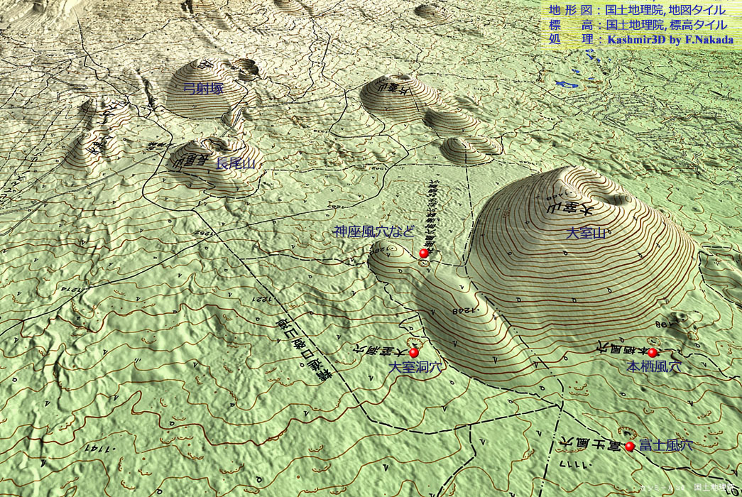 | 地形の三次元イメージ :蝙蝠穴洞穴群(蝙蝠穴,鳴沢氷穴,富岳風穴,龍宮洞穴,西湖蝙蝠穴) |