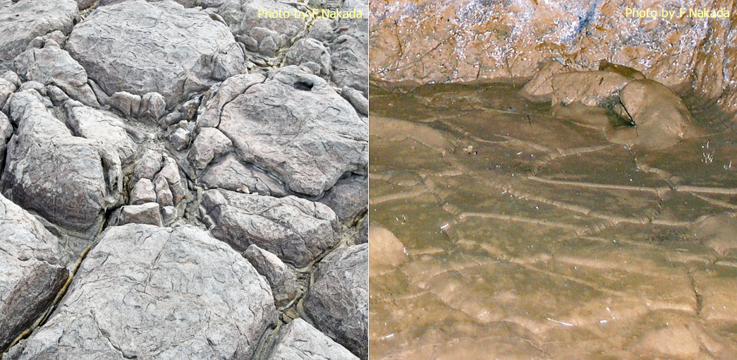 ![]() (左)岩石の例。東尋坊,玄武岩溶岩の柱状節理。構造的に最も強度のある6角柱になっています。 (右)土壌の例。那覇市内,小禄砂岩層由来の土。大雨の度に水浸しという「乾湿繰り返し」による多角形土。6角形が最も多いように思われます。 |