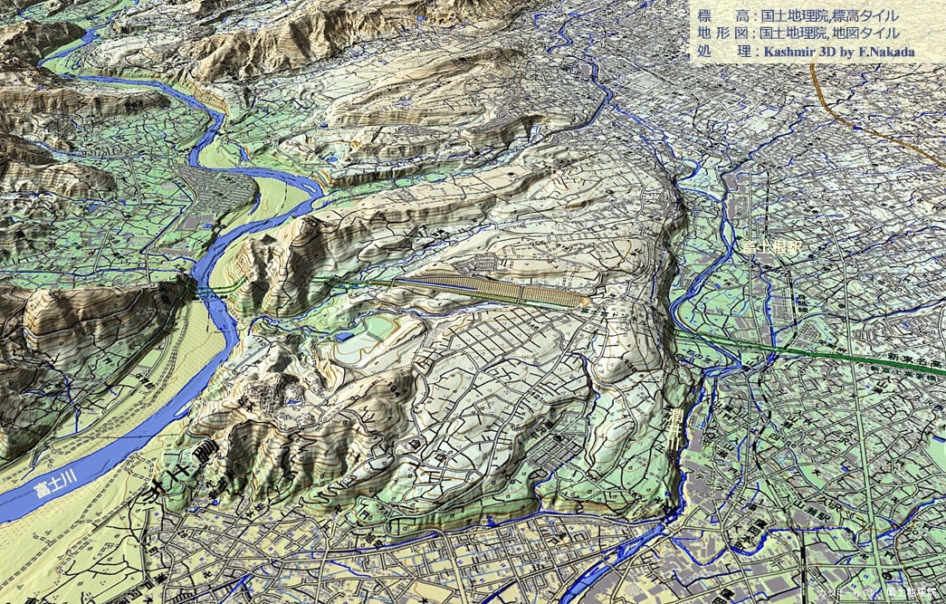 ![]() 「大宮断層」によって隆起した台地には,南北方向の副断層が複数推定されています。 断層が活動しなかったころ,富士山麓と一体となっていたはずなので,潤井川の河道はどうなっていたでしょうか。 現在,放水路となっている地溝だけではなく,地震の度に,赤い矢印の低地を東に移動しながら,流れていたのでは,と想像します。 すると,現河道を含め4回の大地震があった???。 裏付けの無い,想像の世界です。 |