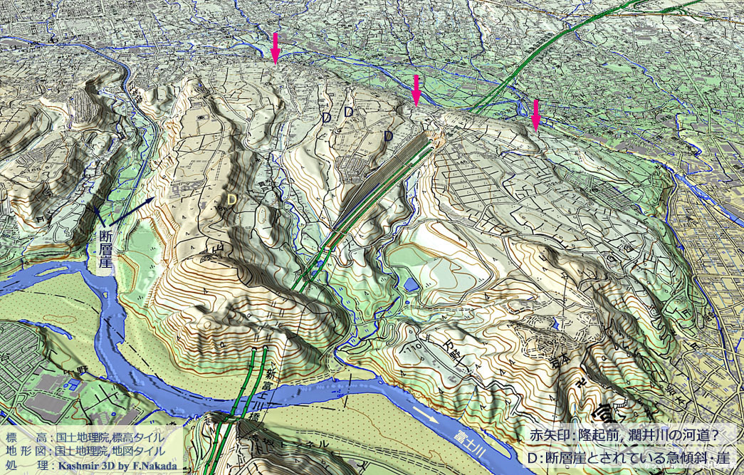 | 地形の三次元イメージ : 大宮断層によって隆起した台地 |