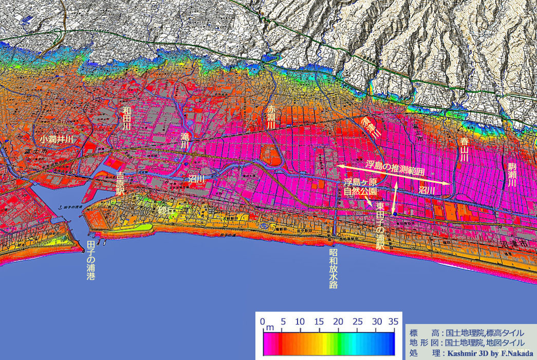 ‼マウスオーバー‼ 地図上にマウスを乗せてください。事務局が作成した「標高段彩図」を表示します。![]() 沼津市の「千本浜」から,「富士川」の左岸河口までが,一般的な「田子の浦海岸」と呼ばれています。 「田子の浦」はすべて「砂浜海岸」で,その上には標高30m弱から10m弱程度の「砂丘」が広がっており, その背後は概ね「後背湿地」となっていました。 過去形なのは,排水が進み湿地帯がほぼ消滅したからです。 |