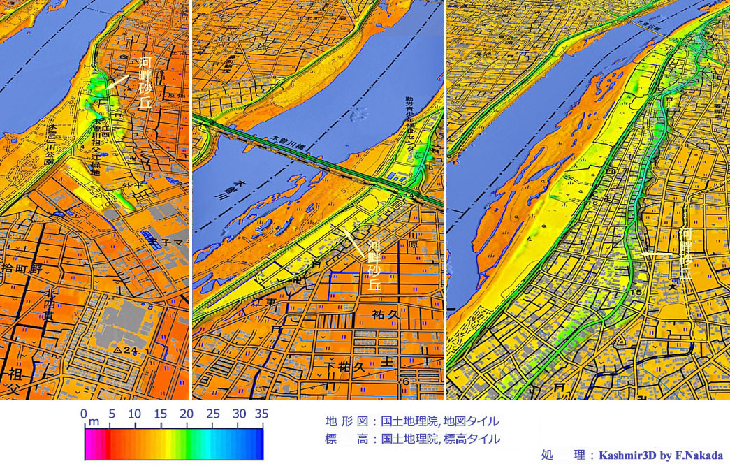 ![]() (右)上流:旧河道の「自然堤防」と思われます。一般の民有地として,家屋が立ち並んでいます。 (中)中流:名神高速道路と東海道新幹線の「木曽川橋梁」が建設された外は,民家と耕作地として利用されています。 (左)下流:河畔砂丘の大半は,「木曽川祖父江緑地」として利用されているようです。 |