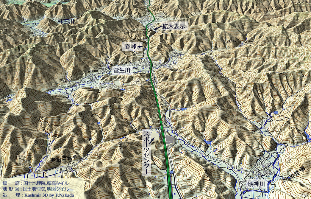 | 地形と都市圏活断層図の三次元イメージ : 姫路市夢前町(菅生川)付近の山崎断層帯 |