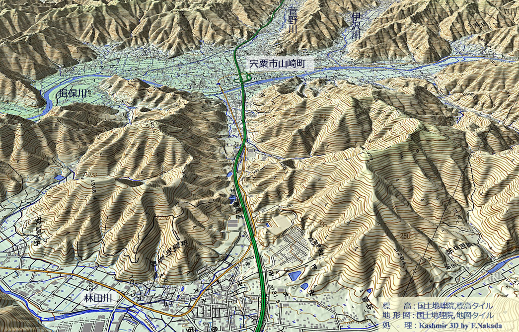 | 地形と都市圏活断層図の三次元イメージ : 宍粟市山崎町付近の山崎断層帯 |