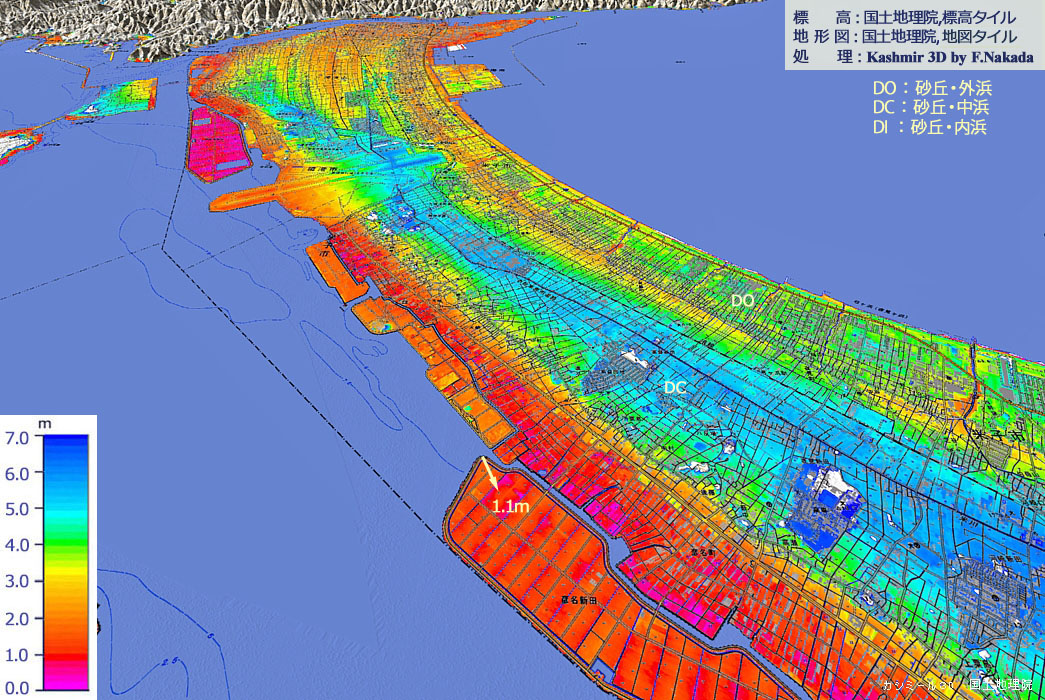 ![]() 「弓ヶ浜半島」の基部では,「砂丘・中浜」が極めて発達しており,少なくとも「標高段彩図」で「砂丘・内浜」を視認することはできません。 弓ヶ浜半島を作った土砂の供給先は「日野川」である,と言われてしますが,「三角州(デルタ)」は形成されていません。 押し出された細粒の砂礫類は,全てが沿岸流で運び去られてしまった,と考えられます。 |