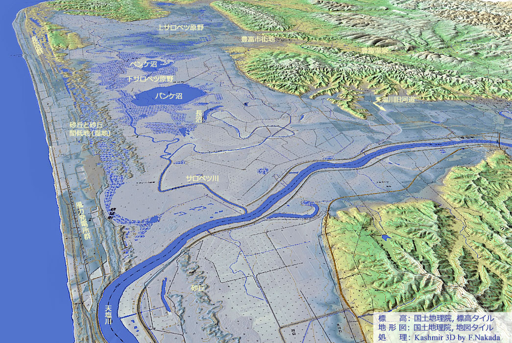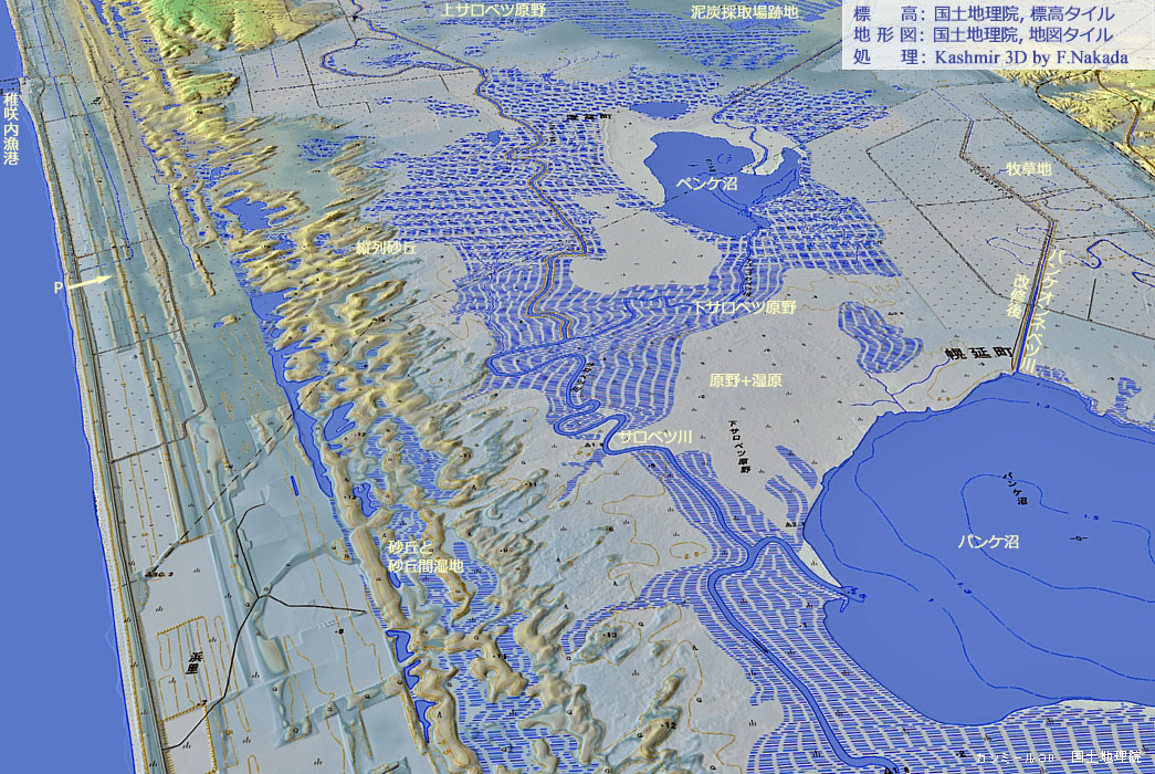 ‼マウスオーバー‼ 地図上にマウスを乗せてください。独自に作成した「標高段彩図」を表示します。![]() 「天塩川」は,サロベツ原野の南の端を自由気ままに流れていたことが,標高段彩図から読み取れます。 自由蛇行が激しすぎて,個々の旧河道を特定することはできそうもありませんが,「長沼」は天塩川の「河跡湖(三日月湖)」であることは読み取れます。 海岸近くの「砂丘列」あるいは「砂丘群」の標高は7m以上あります。 津波に際して,優秀なバリアーになってくれそうです。 |