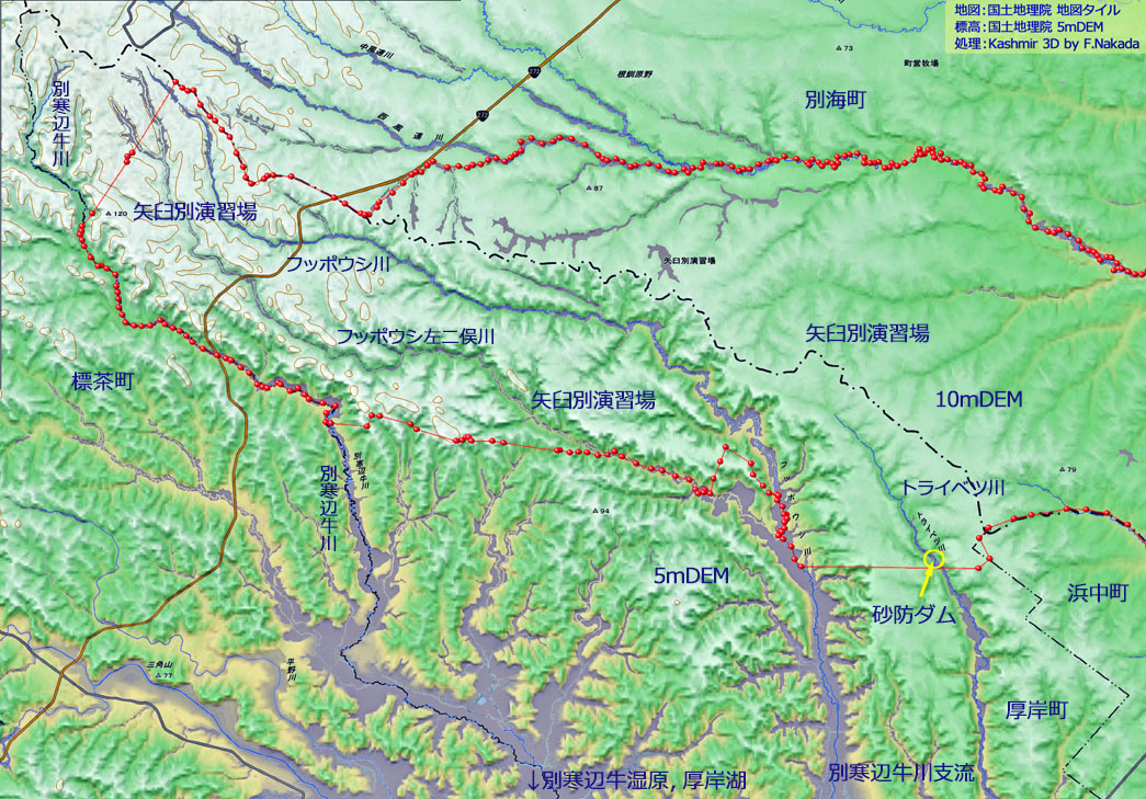 ![]() 「別寒辺牛川」は風連川の西隣,標高150mほどの丘陵に源を持ち,ゆるゆると南下して厚岸湖に注ぐ,蛇行だらけの川です。 地形図を参照するとわかりますが,その源流域は「陸上自衛隊矢臼別演習場」です。 源流部から厚岸湾の河口まで,人工的な構造物の全く存在しない川でしたが, 平成15年10月支流の「トライベツ川」に,演習場からの土砂流出を防止する,と言う名目の砂防ダムが1基建設されました。 |