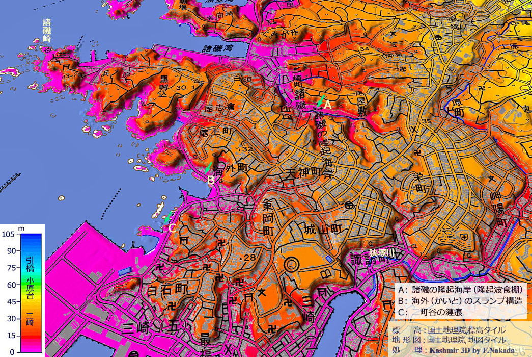 | 地形(標高段彩図)と都市圏活断層図の三次元イメージ : 諸磯の隆起海岸,海外(かいと)のスランプ構造,二町谷の漣痕 |
