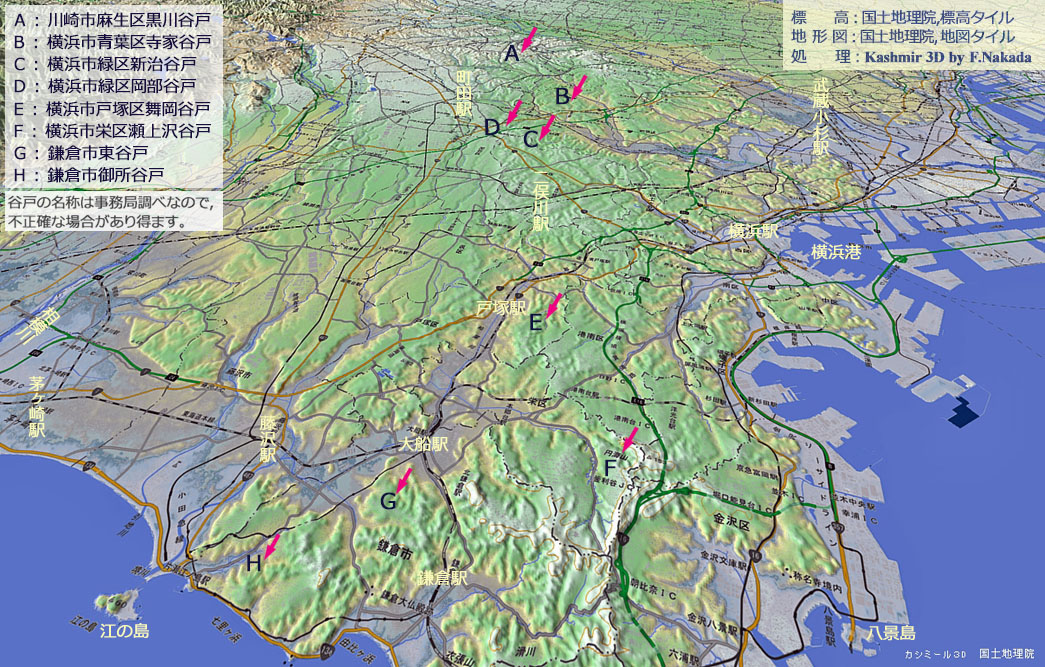 ![]() このページで取り上げた,合計8箇所の谷戸田(谷津田)の概略位置です(廃止分を含む)。 全て,多摩丘陵と三浦丘陵が侵食されてできた「谷戸」に「谷戸田」が作られています。 |