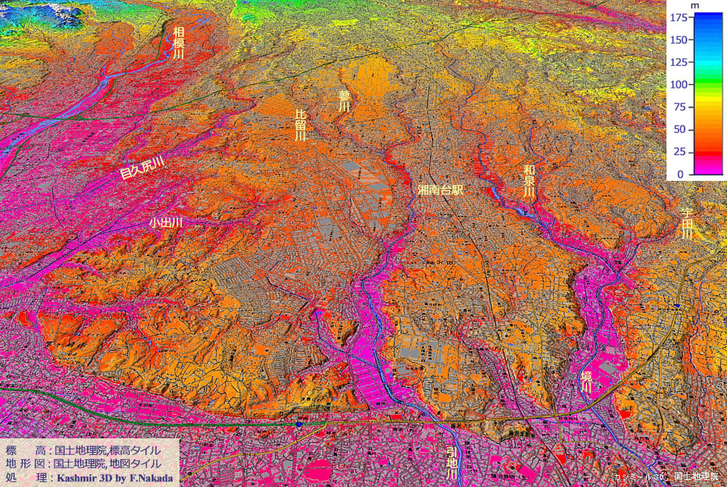 ‼マウスオーバー‼ 地図上にマウスを乗せてください。独自に作成した「標高段彩図」を表示します。![]() 「相模原台地(南部)」は,台地の北部が源流の中小河川と,武蔵野国と相模の国を分ける「境川」の支流群によって,かなり侵食・解析されています。 「引地川」と「境川」では,「湘南台駅」付近より下流部では,下刻侵食の段階は終了して「側方侵食」が優勢となっていて,幅広の河川敷となっています。 |