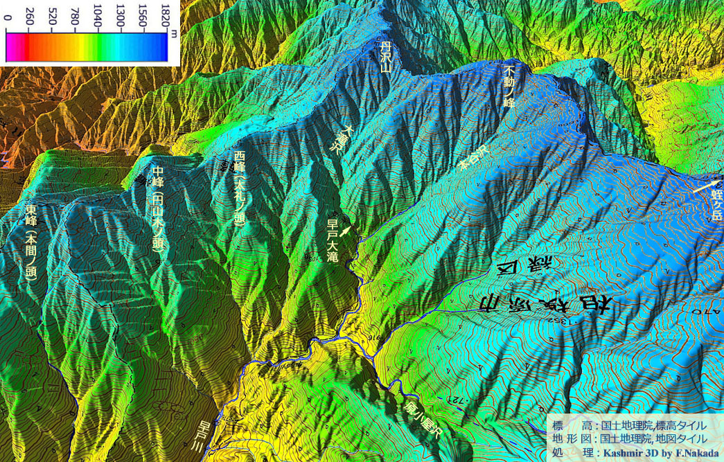 ![]() このイメージに描かれている尾根の間が,全て早戸川の流域です。 早戸川右岸の「三峰尾根」側の谷は,V字を呈しており滝も多いとい特徴があります。 これに対し,本谷沢を含む左岸側の谷は,「原小屋沢」を除いて,幅も広く河床勾配も緩いので,目立った滝はありません。 |