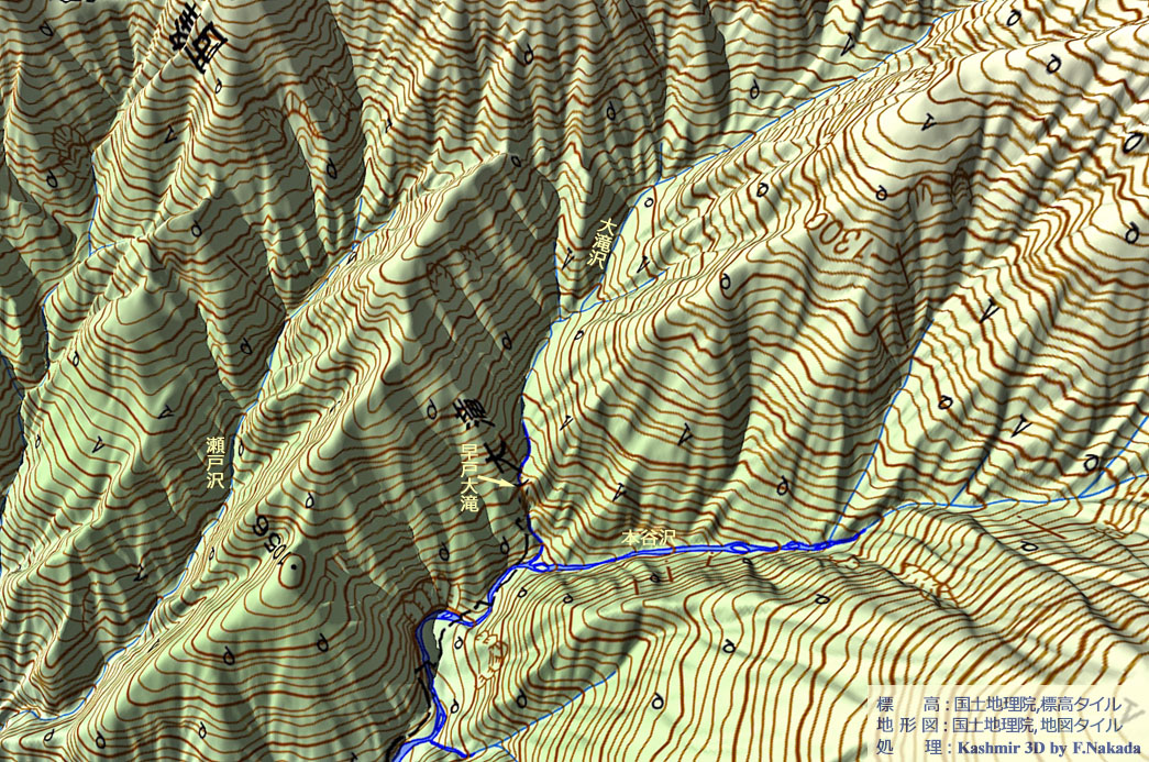 ![]() 「早戸大滝」は,早戸沢にとって本流である「本谷沢」との出会い(合流点)の約100m手前にある,推定落差42m(下記)の「段瀑」です。 |