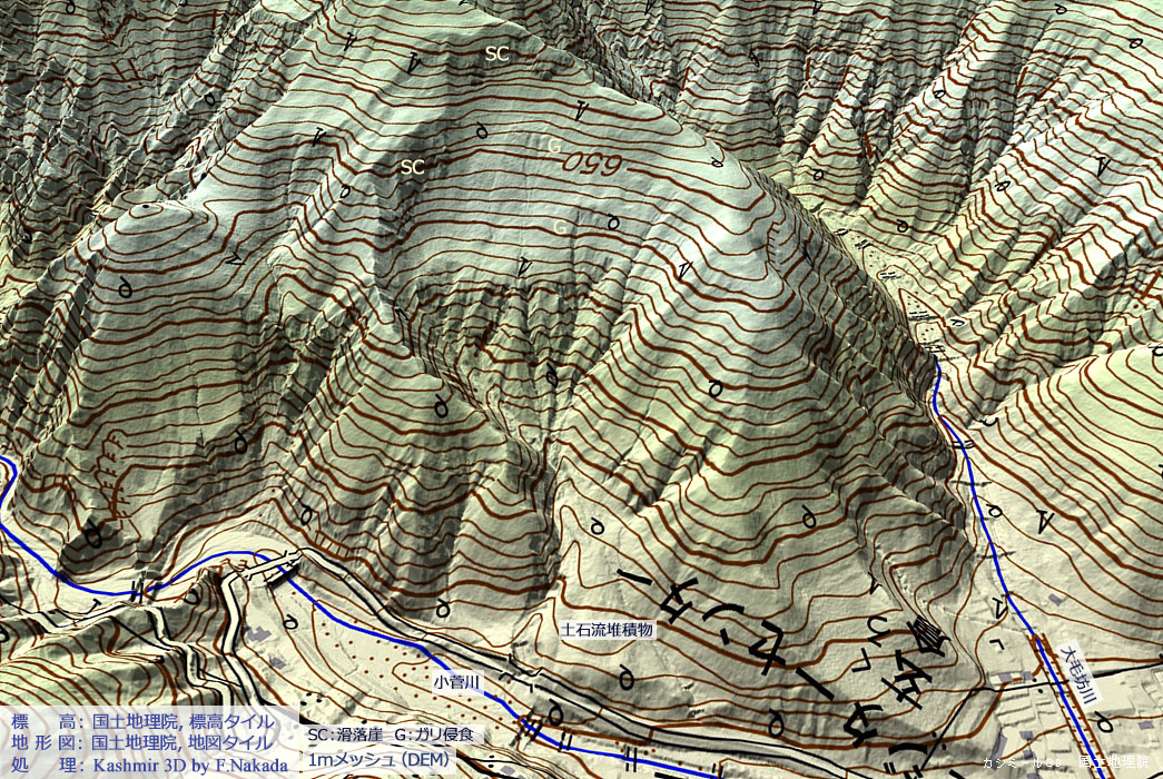 | 地形の三次元イメージ : 崩壊地の現況(1mDEM使用) |