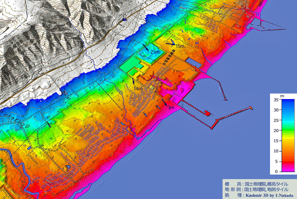![]() 敷地の標高は,海岸の0mから道路沿いの約26mまでと,幅があります。 施工途中の5mDEM(標高データ)なので,もともと存在する湿地帯も含まれているので,ご注意ください。 なお,建屋が建設されるであろう場所の標高は約8mとなっています。 |