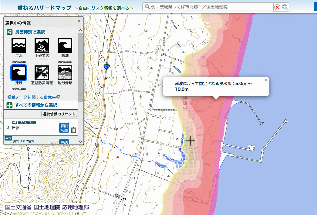| 国によるハザード(ハイリスク)情報:重ねるハザードマップ,津波想定浸水深 |