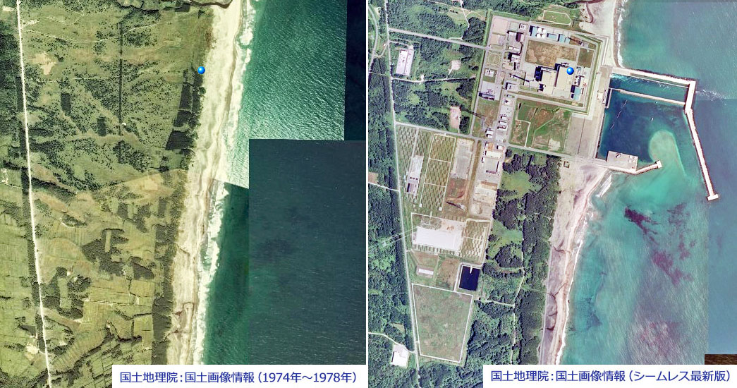 ![]() 建設前の国土画像情報(空中写真)を参照すると,発電所は段丘面の掘削と海岸の浜提の埋立(置換か?)により整地されているようです。 原子炉建屋は,段丘面の上に建設されるようで,埋立による軟弱地盤ではなさそうです。 |
