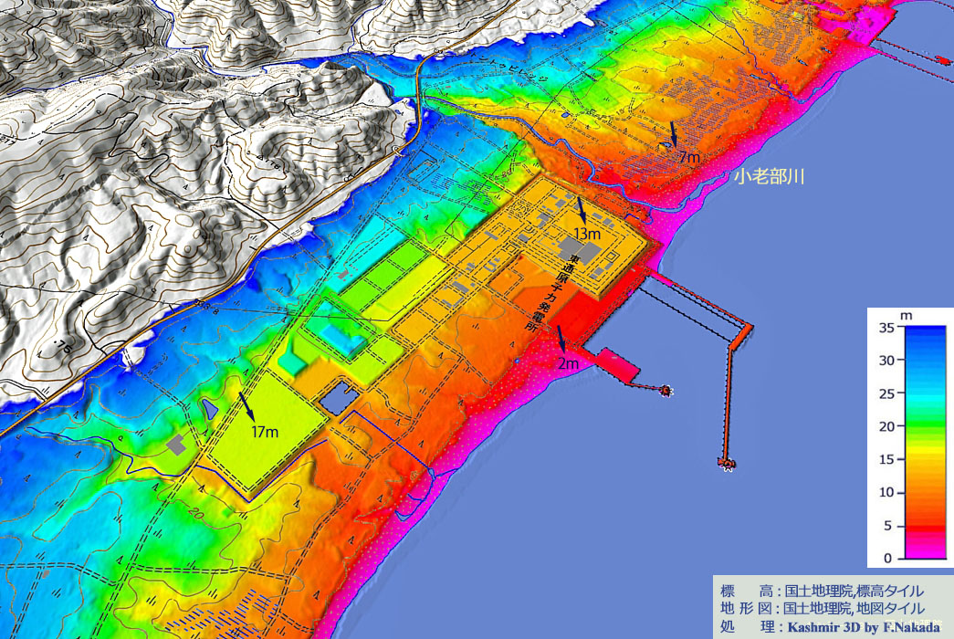 ![]() 国土地理院の5mDEMから推定すると,原子炉建屋付近の地盤高は,約13mと思われます。 この発電所(13m地点)は,段丘面を整地して更に盛り土がなされているようです。 |