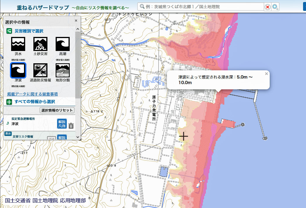 | 国によるハザード(ハイリスク)情報:重ねるハザードマップ,津波想定浸水深 |