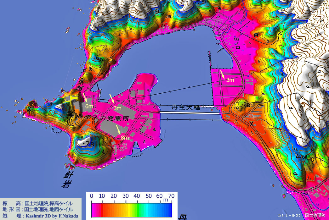 ![]() 国土地理院の「標高タイル」から推定すると,原子炉建屋付近の地盤高は,約3m~約8mと思われます。 襲来が予想されている最大規模の津波でも,海岸での浸水深が1m未満なので,津波の心配はなさそうです。 |