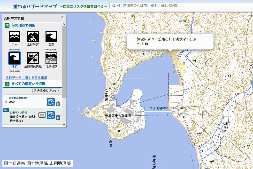 ![]() 重ねるハザードマップを参照すると,地盤標高が3m~8mの原子炉建屋付近の津波想定浸水深は,「なし(0m)」となっています。 一方,対岸の岸壁部分の津波浸水想定深は「0.5m~3.0m未満」となっています。 |