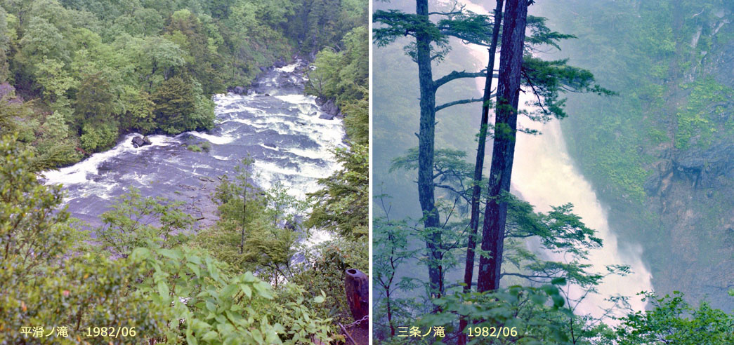 ![]() (左)平滑ノ滝:6月下旬の梅雨の合間での撮影。さすが日本一の水量,と言うだけのことはありました。 (右)三条ノ滝:同上。最も落差のある滝のすぐ上流からの撮影。 滝の幅一杯に川水が流れていました。 |