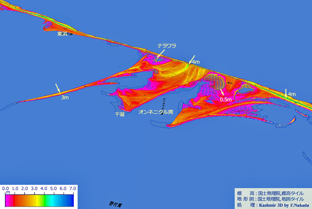 | 地形の三次元イメージと現場写真 : 野付半島(トド原)付近 |