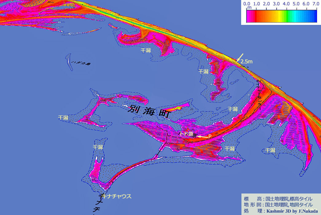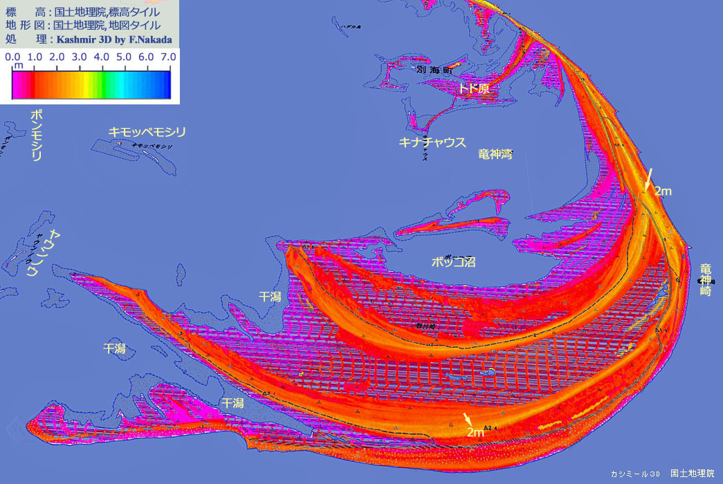 ‼マウスオーバー‼ 地図上にマウスを乗せてください。事務局が独自に作成した「標高段彩図」を表示します。![]() 「野付半島」は,長さが約29kmという,日本で最も長い「砂嘴」です。 この付近の沿岸流は知床半島から南下して根室湾に向かいます。 「国後島」との間に広がる「野付水道」の海底地形の影響でしょうか,この地を流れる「沿岸流」の芸術的ともいえる製品ではないでしょうか。 |