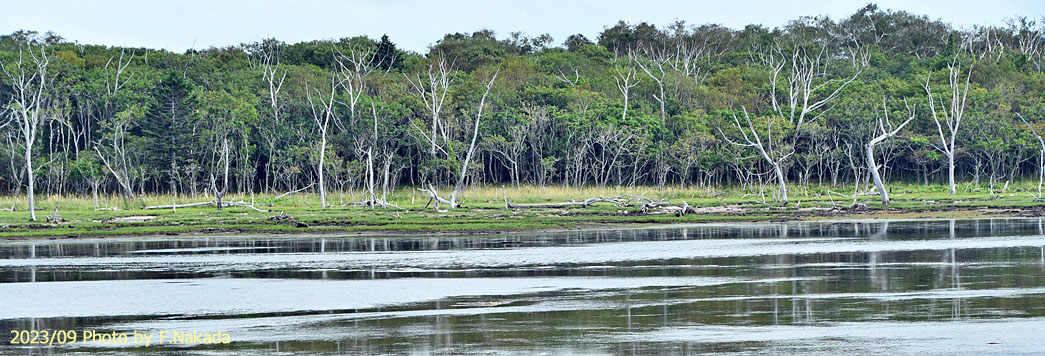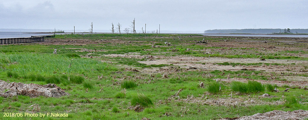 ![]() 「ナラワラ展望スペース」という駐車場で撮影しました。 立ち枯れているのは「ミズナラ」とのことですが,塩分に弱いのでしょうね。 |