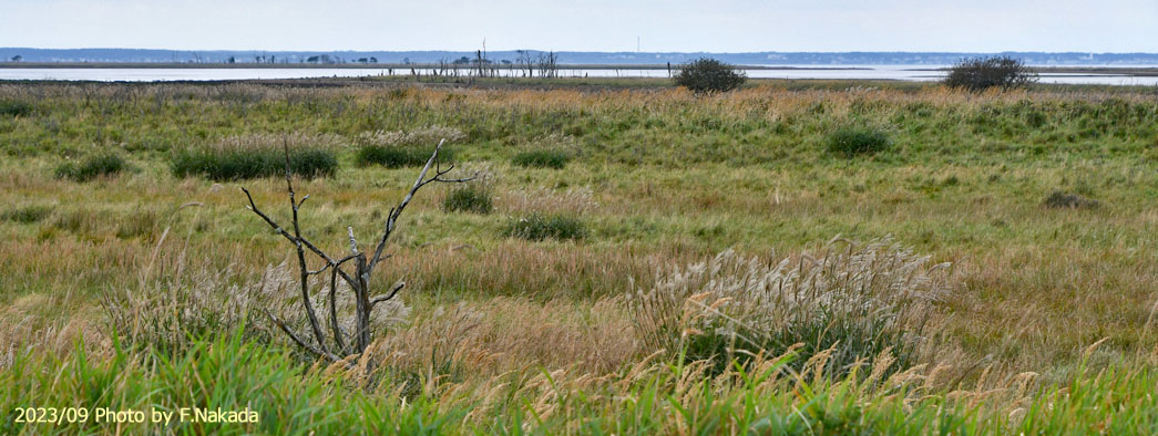 ![]() 「竜神崎」で「砂嘴」の先端方向を撮影しました。 砂嘴の上は一面の草原ですが,立ち木は枯れているものが多いように感じました。 |