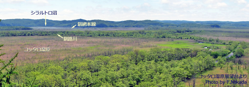 ![]() 標高60m余りの「コッタロ湿原展望台」からの眺めです。 「釧路川」とコッタロ湿原との中間にある,一直線の高まりは「釧網本線」です。 |