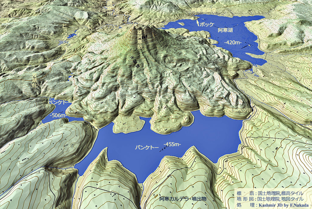| 地形と地質の三次元イメージ : 阿寒カルデラと雄阿寒岳 |