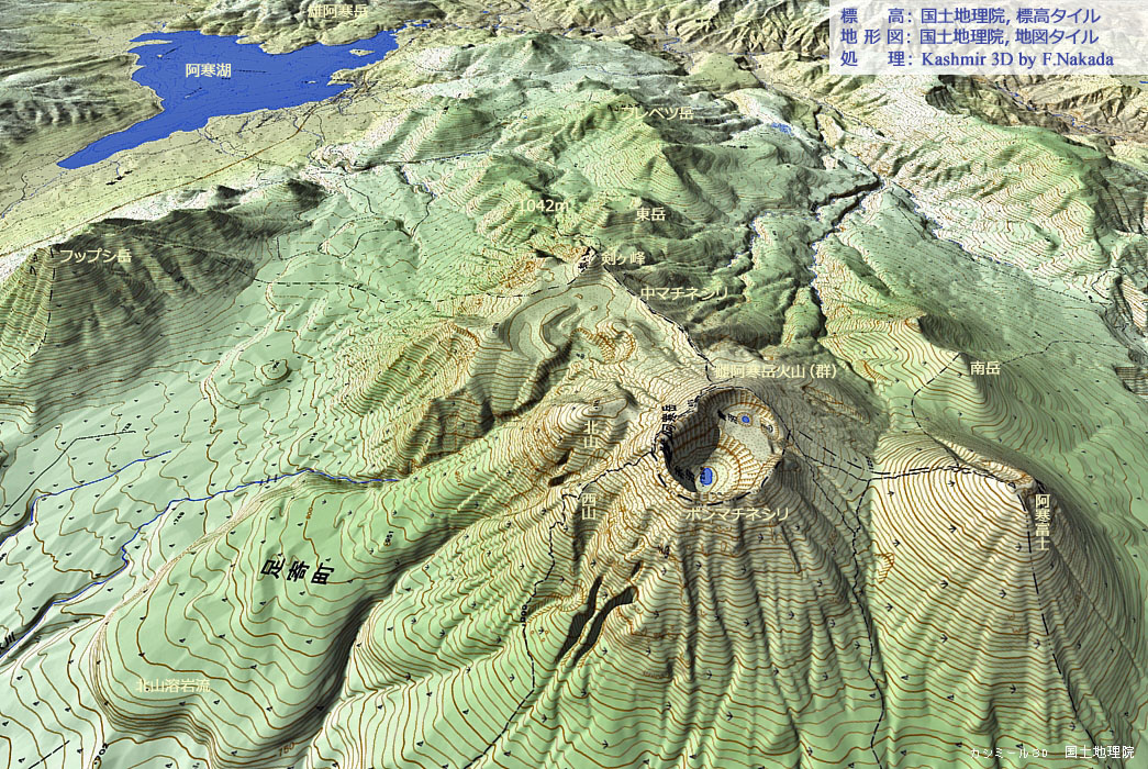 | 地形と地質の三次元イメージ : 阿寒カルデラと雌阿寒岳火山群 |