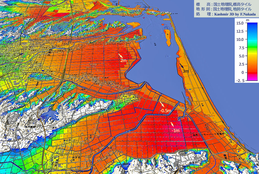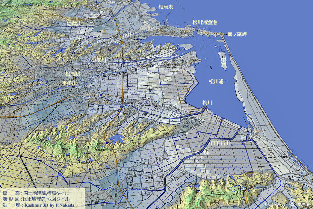 ![]() 元々,鵜の尾岬に近い砂州の先端が開いていましたが,漁港の整備のためでしょうか,砂州を閉じた代わりに,鵜の尾岬の途中を開削して現在に至っています。 空中写真で観察すると,松川浦の北部には干潟がかなりの面積を占めていることがわかります。 松川浦の西側と南側は 「干拓地」のようです。 最も低い土地は,南側で標高が約-1mです。 |