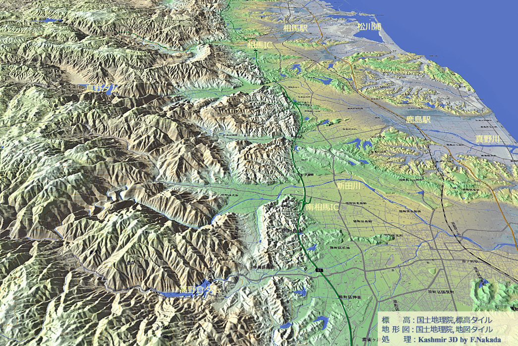 | 地形と活断層図の三次元イメージ : 南相馬市~相馬市,双葉断層 |